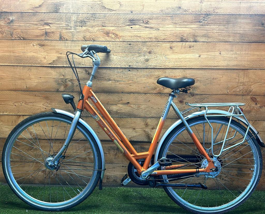 Hoewel de fiets gebruikssporen heeft, is deze technisch volledig gereviseerd en zijn versleten onderdelen vervangen door nieuwe